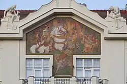 Lovecký výjev na průčelí domu čp. 368 v Praze - Bubenči, 1912, stav po restauraci v roce 2024