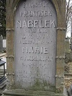 - ↑ Na náhrobku F. Nábělka uváděno chybně datum úmrtí 29. prosince 1915, zápis v matriční knize stejně jako dobové nekrology ovšem uvádí úmrtí 29. října 1915.