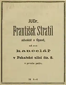 - ↑ Český advokát v Opavě. Opavský Týdenník. 1880-09-25, roč. 11, čís. 39, s. 2. [Národní knihovna České republiky Dostupné online] [cit. 2013-05-18].