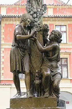 - Wimmerova kašna, pískovec (1797), střední sloup ve tvaru palmy s motivem labutě a milenců (jejichž výklad není jednoznačný, bývá odvozován z biblické Písně písní, nebo považován za alegorii vinařství a sadařství); byla nejprve posunutá z dopravních důvodů od paláce svého objednavatele Jakuba Wimmera v Nových alejích (dnešní Národní třída) koncem 19. století do Wimmerových sadů na Vinohradech a dále po roce 1900 na Uhelný trh v Praze. Originál sousoší byl poškozen vandalem a následně roku 1974 přenesen do Lapidária Národního muzea.