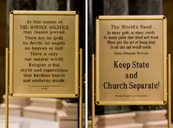 FFRF udržuje během vánoční sezóny v kapitolu státu Wisconsin ceduli s nápisem:[83]