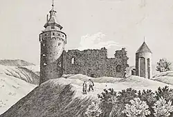 Severní věž se statkem na kresbě Karla Liebschera (19. století) -