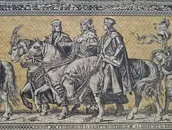 Arnošt, saský kurfiřt (1464–1486), Fridrich II., saský kurfiřt (1428–1464) a Albrecht III., vévoda saský (1486–1500); Fürstenzug, Drážďany.