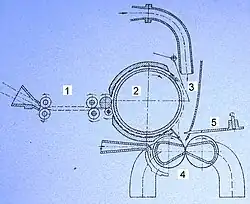 je naznačen na nákresu vpravo: Pramen vláken od mykacího stroje je přiváděn podávacím ústrojím (1) k vyčesávacímu bubnu (2). Jednotlivá vyčesaná vlákna nese proud vzduchu (3) kolem usměrňovacího kotouče (5) mezi spřádací bubny (4). Oba bubny se otáčí stejným směrem a perforací v jejich povrchu se odsává vzduch. Vlivem podtlaku a tření spřádacích bubnů se vlákna stáčí a napojují na otevřený konec příze, která se odvádí k navíjecímu ústrojí.[1]
