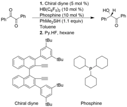 - ↑ Xiaoyu Ren; Haifeng Du. Chiral Frustrated Lewis Pairs Catalyzed Highly Enantioselective Hydrosilylations of 1,2-Dicarbonyl Compounds. Journal of the American Chemical Society. 2016-01-15, s. 810–813. ISSN 0002-7863. doi:10.1021/jacs.5b13104. PMID 26750998.