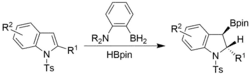 Za podobných podmínek, s použitím N-tosylindolů, lze provádět dearomatizace; jejich produkty jsou syn-hydroborylované indoliny.[17]