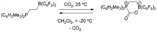 Vnitromolekulární FLP-CO2 je jako pevná látka za pokojové teploty stabilní, ale v dichlormethanovém roztoku se nad -20 °C rozkládá na CO2 a původní FLP.[19]