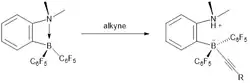 Koncové alkyny se nenavazují na bor hydroboracemi, ale aktivacemi vazeb C-H, napojení protonu na alkynovou skupinu tak vytvoří původní alkyn. Hydrogenace za přítomnosti frustrovaných Lewisových párů tak nelze provést u koncových alkynů, kde vzniká pouze pentafluorbenzen.