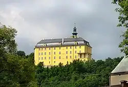 - Zámek na kopci nad městem na místě původního gotického hradu sestává z horní a dolní části. Horní část je renesanční z druhé poloviny 16. století, nejvyšší patro a věž pocházejí až z roku 1633. Po požáru roku 1801 bylo obnoveno jen severní křídlo. Dolní zámek je barokní, z konce 17. století.