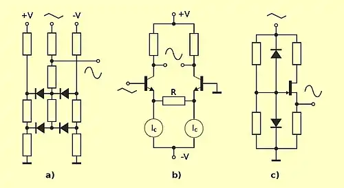 Některé běžné obvody pro tvarování trojúhelníkového napětí na přibližně sinusové zachycuje obr. 4. Používá se např. nelineární dělič s rezistory a diodami (viz obr. 4 a). Jde o postupnou aproximaci sinusového napětí dílčími úseky. Na obr. 5 a je nakresleno jednoduché provedení, které v praxi zajišťuje harmonické zkreslení v nejlepším případě okolo 1 %. Použije-li se více úseků, harmonické zkreslení výstupního napětí může být výrazně menší. Napětí podobné sinusovému lze získat i tvarováním bipolárními tranzistory, pracujícími v oblasti saturace kolektorového proudu. Tvarovací obvod není nijak zvlášť složitý. Zjednodušené schéma najdeme na obr. 4 b. Vzhledem k tomu, že tranzistory a další kritické součástky by měly mít shodné parametry, je tato metoda vhodná pro monolitické integrované obvody. [5] Další možnost představuje tvarování trojúhelníkového napětí prostřednictvím tranzistoru řízeného polem (FET). Samotný tvarovač tvoří jednoduchý obvod s jedním tranzistorem, dvěma diodami a několika rezistory, jak je vidět na obr. 4 c. [6]