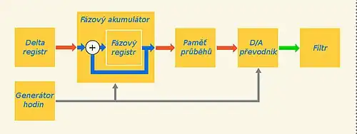 Zjednodušené blokové schéma architektury DDS je na obr. 6. Důležitým obvodem pro syntézu je fázový akumulátor, který generuje adresy, na nichž jsou v paměti uloženy vzorky příslušné funkce. Fázový akumulátor je tvořen fázovým registrem, nesoucím informace o fázi aktuálně generovaného bodu průběhu a sčítačkou. Tzv. delta registr obsahuje údaj o fázovém přírůstku, určujícím frekvenci generovaného průběhu. Změna frekvence se provádí zápisem do tohoto registru. [13] Aby generátor mohl mít analogový výstup, musí obsahovat také digitálně-analogový převodník. Důležitý je též výstupní filtr typu dolní propust, potlačující nežádoucí vyšší složky (antialiasing). Jedním z nedostatků techniky DDS je tzv. jitter (horizontální třesení), které však lze výrazně potlačit pomocí digitálního filtru.