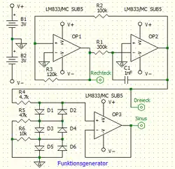 Na obr. 5 je nakreslen jednoduchý analogový funkční generátor, který obsahuje celkem tři operační zesilovače. Operační zesilovač OP2 je zapojen jako integrátor a operační zesilovač OP1 pracuje jako komparátor. Integrační kondenzátor 1 nF se periodicky lineárně nabíjí a vybíjí, protože na vstup integrátoru je připojeno obdélníkové napětí z komparátoru OP1. Na výstupu OP1 je tedy k dispozici obdélníkové napětí a z výstupu OP2 lze odebírat trojúhelníkové napětí. Rezistory R5 a R6 a diody D1 až D6 tvoří jednoduchý tvarovač trojúhelníkového průběhu na sinusový. OP3 je zapojen jako oddělovací výstupní zesilovač pro sinusové napětí. U tohoto generátoru není na obrázku zakresleno plynulé přelaďování frekvence. Rovněž není vyřešena regulace velikosti výstupního napětí.