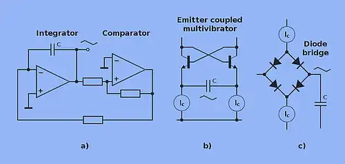 V určitých integrovaných obvodech se pro generování trojúhelníkového napětí používá emitorově vázaný multivibrátor se zdroji konstantního proudu v emitorech tranzistorů, mezi nimiž je zapojen kondenzátor, což zachycuje obr. 3 b. [3] V některých funkčních generátorech se kondenzátor střídavě nabíjí a vybíjí pomocí dvou samostatných zdrojů konstantního proudu s opačnou polaritou, přičemž přepínání zajišťuje diodový můstek, jak znázorňuje obr. 3 c. [4]