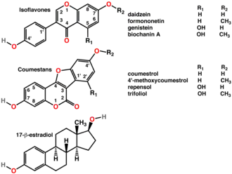 Fytoestrogeny se hojně vyskytují v sójových bobech. Do lidského těla se dostávají při jejich konzumaci. Kvůli své strukturální podobnosti s ženským hormonem estrogenem mohou mít antiestrogenní účinky.[1] Z tohoto důvodu bývají využívány jako přírodní alternativa při hormonální léčbě nebo při prevenci karcinomu prsu a prostaty.