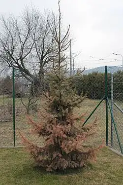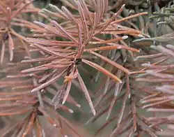 Zčervenání až zhnědnutí jehlic, rychlé odumření jehlic. Nejdříve poškozeny jsou nejmladší letorosty.