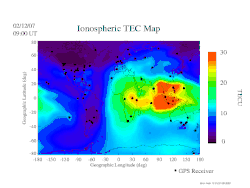 Radiový signál vysílaný z družice se ve vzdálenosti 500-20 200 km od povrchu šíří téměř vakuem. Ionosféra, která se nachází v rozmezí 50–500 km nad povrchem země, obsahuje množství volných elektronů a iontů, které způsobují refrakci (lom) rádiového signálu, tedy jeho delší dráhu a zpoždění. Stav ionosféry ovlivňuje aktuální i cyklická (11 let) aktivita slunce, globální meteorologické vlivy, roční období, fáze dne. V přijímačích je implementován základní model, který tyto změny zohledňuje a navigační zpráva obsahuje vstupní parametry pro jeho výpočet. S výhodu lze modelovat pomocí kulových funkcí, klíčovou hodnotou v modelu je pak TEC (Total Electronic Content)[40]. Analýzou signálu na různých kmitočtech (L1, L2) lze tuto chybu eliminovat, protože změna rychlosti rádiového signálu ionosférou je frekvenčně závislá.