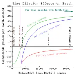 - rozdílné gravitační potenciály (Obecná teorie relativity) ve značné vzdálenosti nad Zemí, protože intenzita gravitačního pole klesá s druhou mocninou vzdálenosti (pro orbit družic 16×): hodiny se zrychlují +50×10−9 %