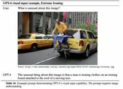 GPT-4 může přijmout zadání v podobě textu a obrázků, což uživateli umožňuje zadat jakoukoli zrakovou nebo jazykovou úlohu. Konkrétně generuje textové výstupy (přirozený jazyk, kód atd.), pokud jsou zadány vstupy skládající se z proloženého textu a obrázků. V celé řadě oblastí - včetně dokumentů s textem a fotografiemi, diagramů nebo snímků obrazovky - vykazuje GPT-4 podobné schopnosti jako v případě čistě textových vstupů.[3] Obrázkové vstupy jsou zatím výzkumným náhledem a nejsou veřejně dostupné.
