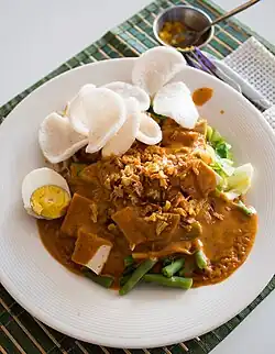 Peanut sauce, zelenina, rýžový koláček, vařené vejce, sůl, Palmový cukr, Tempeh, čajot, okurka setá, tofu, povijnice vodní, semenáč, Bhut Jolokia, slepičí vejce a tamarind indický
