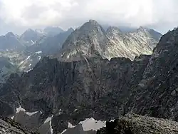 Pohled ze severu, zleva Rumanov štít a Ganek, uprostřed Vysoká (mrak) a Těžký štít, vpravo Rysy
