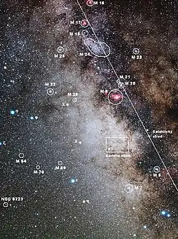 Galaxie (nazývaná také Mléčná dráha), v které se nachází Sluneční soustava, má tvar vícepramenné spirály a při pohledu z boku je ve svém středu vydutá. Protože se Sluneční soustava nachází blízko roviny spirály (disku), na naši Galaxii se díváme téměř přesně z boku. Tomu odpovídá i hustota pásu Mléčné dráhy, která je vidět na obloze. Nejhustší a zároveň nejjasnější je Mléčná dráha v souhvězdí Střelce, proto se předpokládalo, že někde tam musí být jádro galaxie. Jeho přesná poloha však nebyla dlouho známá, neboť právě v tom směru leží hustá molekulární oblaka,[1] která všechno světlo přicházející směrem od jádra oslabuje až o 30 magnitud. Přes tato mračna k nám tak projde jen jedna biliontina emitovaného světla.