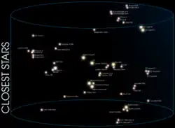 Do vzdálenosti asi 15 parseků (49 světelných let) od Slunce se nachází asi 208 hvězd, které jsou jasnější než absolutní velikost 8,5, což dává hustotu jedné hvězdy na 69 kubických parseků nebo jedné hvězdy na 2 360 kubických světelných let (viz seznam nejbližších jasných hvězd). Na druhé straně existuje 64 známých hvězd (jakékoli velikosti, nepočítaje 4 hnědé trpaslíky) do 5 parseků (16 světelných let) od Slunce, což dává hustotu asi jedné hvězdy na 8,2 kubických parseků nebo jednu na 284 kubických světelných let (viz seznam nejbližších hvězd). To ilustruje skutečnost, že existuje mnohem víc slabých hvězd než jasných: na celé obloze je asi 500 hvězd jasnějších než hvězdná velikost 4, ale 15,5 milionu hvězd jasnějších než hvězdná velikost 14.[131]