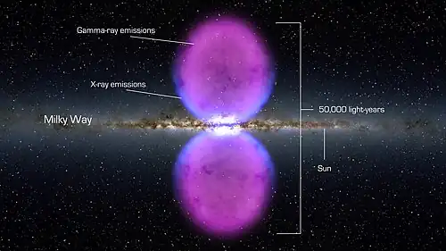 V roce 2010 byly pomocí dat z Fermi Gamma-ray Cosmic Telescope na sever a na jih od galaktického jádra detekovány dvě gigantické protilehlé sférické struktury energetického plazmatu produkující vysokou úroveň emisí gama a rádiového záření. Tyto struktury byly nazvány Fermiho bubliny. Průměr každé z bublin je asi 25 tisíc světelných let (7,7 kpc) a na noční obloze sahají až po souhvězdí Jeřába a Panny.[86][87] Následná pozorování Parkesovým dalekohledem na rádiových frekvencích identifikovala polarizovanou emisi, která je spojena s Fermiho bublinami. Tato pozorování lze asi nejlépe interpretovat jako magnetizovaný výtrysk z tvorby hvězd v centrální části Galaxie o průměru 640 světelných let (200 kpc).[88] Roku 2020 byly objeveny i rentgenové bubliny.[89] Protože je objevil teleskop eROSITA, nazývají se eROSITA bubliny.[90] Patrně ale nejsou symetrické.[91] Společnou příčinou by mohla být událost, která nastala před 2,6 miliony let,[92] tedy na počátku kvartéru.