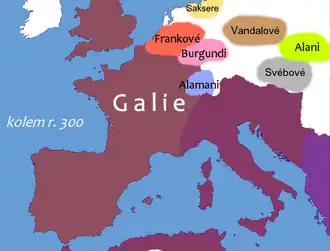 Galie v pozdní antice se postupně vymaňovala z moci starověkého Říma a dostala se pod nadvládu Germánů, především Franků. Území Galie, tvoří dnešní Francii a v polovině 1. století př. n. l. se stalo římskou provincií. Oblast, která je ohraničená Alpami, Pyrenejemi a Atlantikem, byla obývána keltskými kmeny (Římany označovanými jako Galové), které se pod vlivem svého vyspělejšího souseda, Římské říše stále více pořímšťovaly. Pořímštění bylo uspíšeno během galských válek vedených Juliem Caesarem a dovršeno za vlády císaře Augusta, kdy se celá oblast začala nazývat Římskou Galií. Zhruba do 3. století Galie velmi prosperovala a stala se nejbohatší římskou provincií. Ve 3. století byla, stejně jako celá říše, postižena krizí. V tomto období začal ze severovýchodu sílit tlak do té doby za hranicemi držených germánských kmenů, které lákalo bohatství Galie.