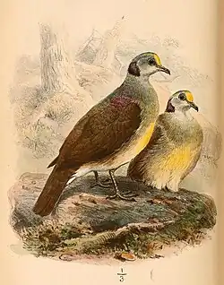 - ↑ a b GIBBS, D.; BARNES, E.; COX, J. Pigeons and Doves. London: Christopher Helm Publishers, 2001, reprinted 2010. ISBN 978-1-8734-0360-0, ISBN 978-1-4081-3555-6. S. 395–396.