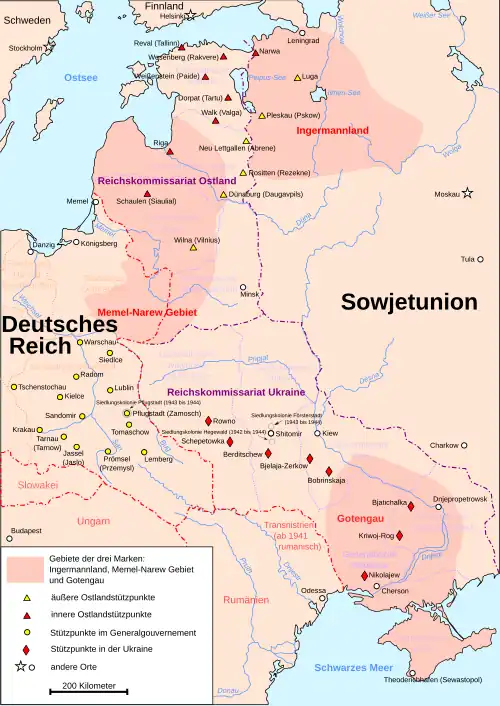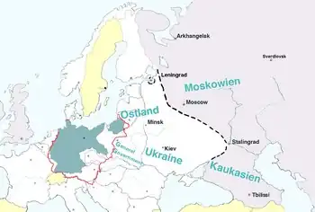 VYSVĚTLIVKY: Tmavě šedá – Německo (Německá Říše). Tečkovaná černá čára – rozšíření detailního plánu „druhé fáze osídlování“. Světle šedá – plánované území administrativních jednotek Říšského komisariátu; jejich jména psaná modrou barvou jsou Ostland (1941-1945), Ukrajina (1941-1944), Moskva (nezrealizovaná) a Kaukasus (nebyl zrealizován)