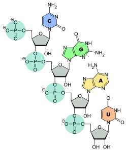 Kyselina ribonukleové obsahuje kromě zbytku kyseliny fosforečné sacharid ribózu a čtyři nukleové báze: adenin (A), guanin (G), cytosin (C) a uracil (U). Molekula je tvořena jedním řetězcem ve tvaru šroubovice. RNA je mnohem méně stabilní, než je DNA.