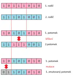 Na výsledné potomstvo se aplikuje ještě mutace. Ta s malou pravděpodobností jednoduchým způsobem náhodně mění hodnotu jednotlivých bitů. V náhodně vybraných chromozomech tedy změníme hodnotu bitu: