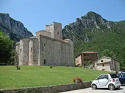 - Tempio del Valadier, Eremo di Santa Maria infra Saxa ( Valadierova svatyně a poustevna Panny Marie) - necelý kilometr od Grotte di Frasassi proti proudu řeky Sentino se v jižní stěně hory Frasassi (708 m n. m.) nachází jeskyně, která byla jako první před objevem obřích podzemních prostor z roku 1971 nazývána "Grotte di Frasassi". Nejstarší písemná zmínka o L'Eremo di Santa Maria infra Saxa - klášteru benediktýnek, částečně zatesaném do skály - je z roku 1029. V bezprostřední blízkosti při vstupu do jeskyně se nachází Tempio (též někdy označovaný jako tempietto, tj. chrámek, malá svatyně) del Valadier. Jedná se o osmibokou sakrální stavbu, kterou zde v roce 1828 nechal postavit papež Lev XII. podle návrhu slavného architekta Giuseppe Valadiera.[7]