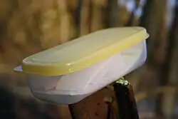 - Střední – schránka běžné velikosti, vejdou se do ní kromě logbooku i větší předměty na výměnu, malé plyšové hračky apod. Často se pro ni používají běžné krabice na ohřívání potravin v mikrovlnné troubě.