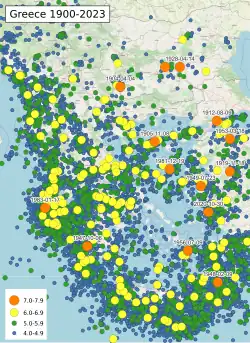 Mapa zemětřesení v Řecku a přilehlých zemích 1900–2017