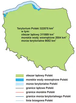 Celková rozloha polského teritoria je 322 575 km².[1] Specifická práva má Polsko v polské výlučné ekonomické zóně, která od roku 2018 má rozlohu 19 749 km². Hranice polské výlučné ekonomické zóny na Baltu je vymezena smlouvami s Německem (I když se jedná o smlouvu s Německou Demokratickou Republikou. Po sjednocení Německa není zcela jasné zda Německá Spolková Republika tuto smlouvu uznává na rozdíl od uznané hraniční smlouvy na pevnině.), Švédskem, Ruskem a od 2018 roku také s Dánskem. Do roku 2018 měla polská výlučná ekonomická zóna rozlohu 22 634 km² (včetně sporné oblasti s Dánskem a přilehlé zóny).[1] S Dánskem (oblast ostrova Bornholm) probíhal v letech 1978–2018 územní spor. Dánská a polská ekonomická zóna se dlouho prolínaly a existovala tak sporná oblast, kterou si nárokovaly oba státy.[3][4][5][6] 19. listopadu 2018 byla mezi Polskem a Dánskem podepsána smlouva o rozhraničení sporné oblasti na Baltu končící spor táhnoucí se od roku 1978. Ze sporných 3600 km² připadlo Polsku 715 km² a 2885 km² Dánsku.[7][8][9] Po podepsání poslední smlouvy polská výlučná ekonomická zóna se rozkládá na ploše 19 749 km² a celý průběh hranic je právně uregulován dvoustrannými smlouvami se sousedními zeměmi. Za podpisem smlouvy stála stavba plynovodu Baltic Pipe, který po zprovoznění v roce 2022 do Polska dodává zemní plyn z Norska. Výlučná ekonomická zóna se nachází za teritoriálním mořem (začíná 12 mil od základní linie a končí 200 mil od ní, respektive 370 km od základní linie; přilehlá zóna vytyčená Polskem v roce 2015 se nachází mezi teritoriálním mořem a zbytkem výlučné ekonomické zóny – začíná 12 mil od základní linie a v závislosti na místě může dosahovat až 24 mil od základní linie). V polské ekonomické zóně Polsko provozuje mořské vrtné plošiny Baltic Beta, Petro Giant, Lotos Pertobaltic, Petrobaltic a PG-1.