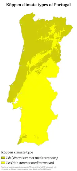 Většina Portugalska má podle Köppenovy klasifikace podnebí teplé středozemní podnebí.