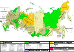 Republiky, autonomní okresy a autonomní oblasti jsou vytvořeny podle etnického klíče (jejich obyvateli jsou Tataři, některé kavkazské a ugrofinské národy, domorodé národy Sibiře a další).