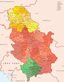 Území Srbska je rozděleno na tři celky; dva autonomní kraje doplňuje vlastní Centrální Srbsko (to však netvoří správní celek). Tyto se dále člení na obvody, odpovídající okresům. Zajímavostí je fakt, že v celém Srbsku je pouze 24 měst (gradovi), menší ale početnější jsou městské obce (gradska naselje; s minimálně 2000 obyvateli). Nejpočetnější jsou základní správní jednotky, odpovídající obcím (naselje).