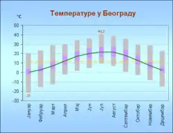 Průměrná teplota v lednu dosahuje v nížinách 0 až -2 °C, ve vyšších polohách -2 až 4 °C, v červenci je to kolem 22 °C v nížinách a asi 18 °C v hornatých oblastech. Celoroční průměr nížinatých oblastí dosahuje 10,9 °C, ve středních polohách s nadmořskou výškou přibližně 1000 m n. m. je to kolem 6,0 °C. Nejnižší absolutní teplota v Srbsku -39,5 °C byla naměřena 13. ledna 1985 v osadě Karajukića Bunari v horách na jihozápadě země, nejvyšší teplota 44,9 °C byla pozorována 24. července 2007 v místě Smederevska Palanka v centrálním Srbsku.
