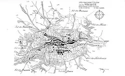 Nejstarší známé vyobrazení města Třebíče (cca 1720), které objevil třebíčský archivář a historik Vincenc Sameš, v tehdejším valdštejnském archivu v Doksech roku 1931. |