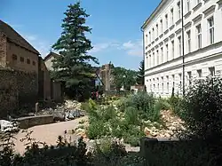 Geopark u budovy školy, v pozadí říčanský hrad -