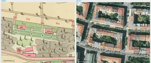 Dvě Prahy umožňují porovnávat podobu jednoho území ve dvou časových obdobích zachycené na ortofotomapách. Dnešní stav Prahy můžete porovnat s obdobími před 80, 60, 40 a 20 lety na podkladě historických leteckých snímků od roku 1938 do současnosti.