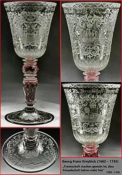 - ↑ a b c d Northern Bohemia, 1700 -1730, probably Georg Franz Kreybich, fine and extremely rare glass blown and cut the wheel (česky: Severní Čechy, 1700 -1730, pravděpodobně Georg Franz Kreybich, jemné a mimořádně vzácné sklo foukané a broušené na kruhu) [online]. web: Antico Antico and Design com [cit. 2022-02-17]. Dostupné online. (angličtina)