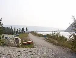 Památník Georgea Dawsona na břehu řeky Yukon ve městě Dawson