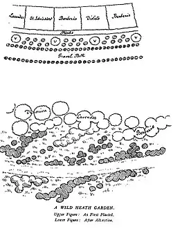 Obrázek, kde G.Jekyllová popisuje rozdíl mezi výsadbou běžného zahradníka (nahoře) a svou (dole).
