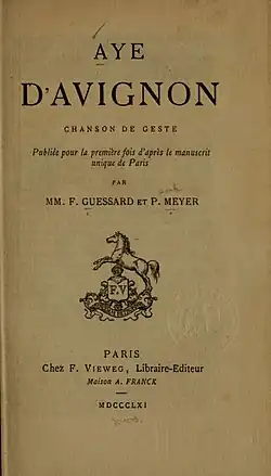 - Aye d'Avignon (1195 až 1205), epos o dceři vévody z Avignonu, neteři Karla Velikého a manželce Garniera de Nanteuil.