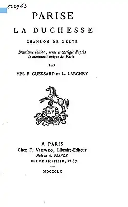- ↑ MICHAJLOV, Andrej Dmitrijevič. Французский героический эпос. Вопросы поэтики и стилистики. 1. vyd. Moskva: Российская академия наук, 1995. 360 s. Dostupné online. ISBN 5-201-13233-2. S. 289. [dále jen Michajlov].