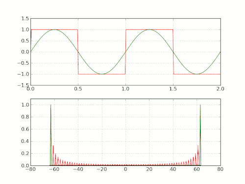 Obrázky vpravo ukazují Gibbsův jev pro obdélníkový průběh (s amplitudou ), jehož Fourierův rozvoj je