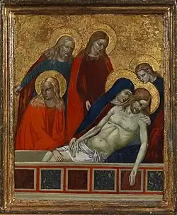 Obraz Pieta svatého Remigia namaloval Giottino pro florentský kostel San Remigio. Na zlatém pozadí stojí svatý Benedikt a biskup svatý Remigius s ochranitelským gestem nad dvěma klečícími ženami, jedna je řeholnice a druhá mladá, elegantně oblečená žena. Je možné, že zde umělec zobrazil zadavatelky obrazu. Na pravé straně plátna ukazuje Josef z Arimatie Nikodémovi hřeby a pohár, možná Svatý Grál. Postava Marie Magdalény přitahuje pohled diváka svým červeným pláštěm, po kterém splývají dlouhé vlasy. Magdaléna je zobrazena v melancholické póze, poněkud stranou ostatních postav, žalem schoulená, s rukou podpírající hlavu se stává zosobněním nejhlubší lidské bolesti.[1]